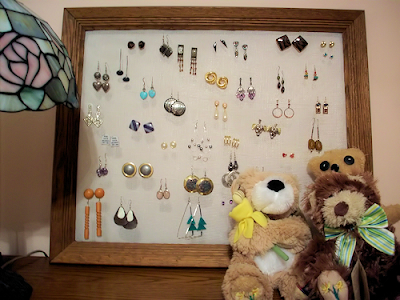 It's time to hang your earrings! The frame below is my mom's - as you can see, she has more earrings than I do. And, in case you were wondering, the teddy bears are significant - the one with the daffodil was given to her by her bff when my aunt died a while back. My sister made the one in the very back with the black button eyes & nose.
