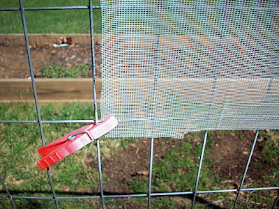 Next, hang up your screen outside. I suppose you could lay it down on some old newspaper, but this method worked best for me (and my mom.) I pinned mine to a garden climber, but you could pin yours to a close line or even a tree branch.